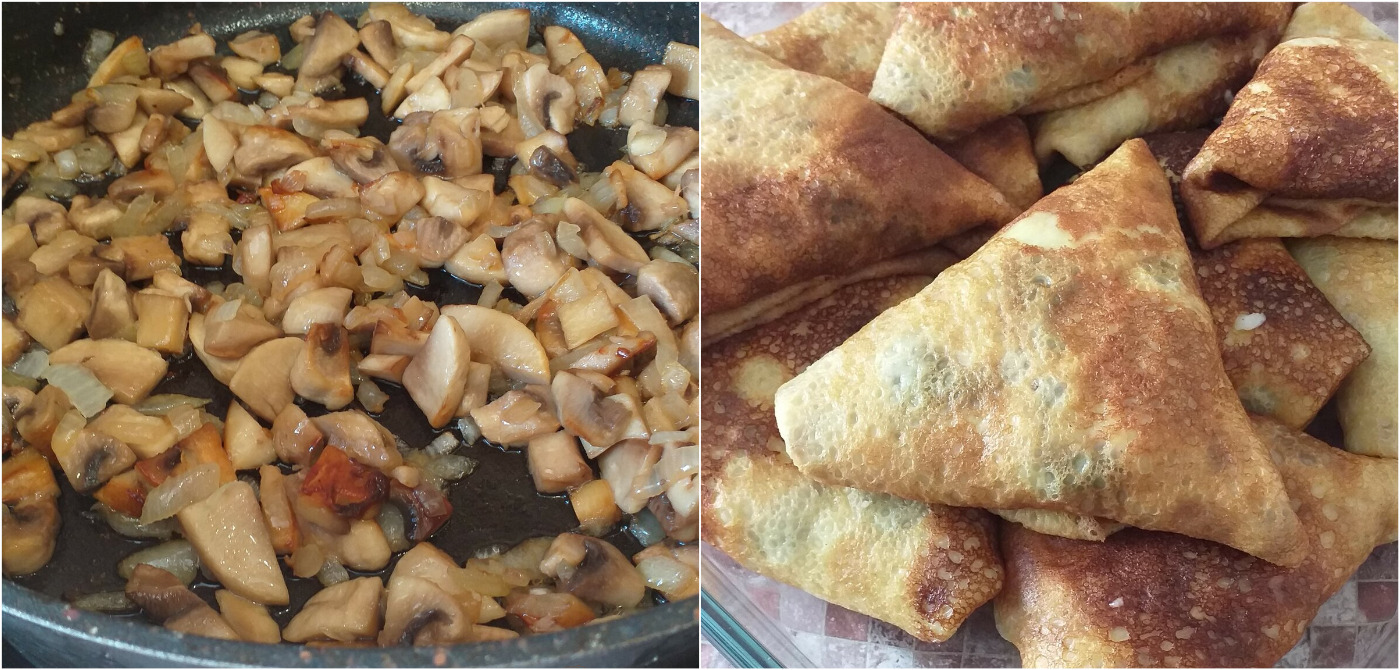 Як начинки для фаршу я взяв відварне куряче м’ясо, свіжі шампіньйони, цибулю і трохи сиру (начинка буде обсмажуватися і тушитись з додаванням вершків – приголомшливий смак).