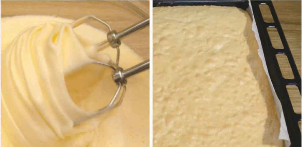 8 яєць збити з 0,5 л цукру до пишної білої маси. Додати 1 ч. ложку амонію (погасити 2 ст. ложками оцту) і 0,5 л борошна, акуратно перемішати. Пекти у застеленій пергаментом формі при 170С до сухої палички. На велику форму.