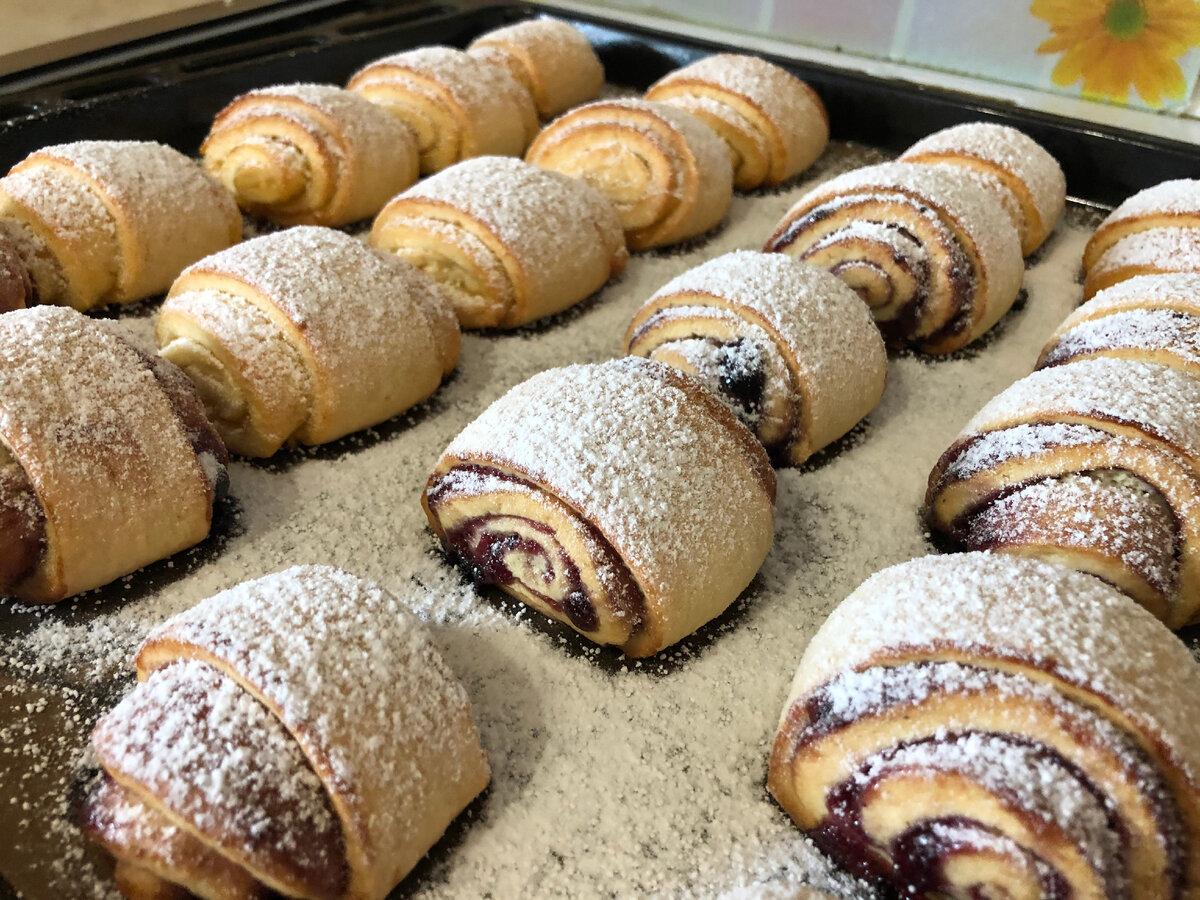 Робочу поверхню присипаємо борошном і розгортаємо тісто в прямокутний пласт товщиною 1-2 мм ( при розкачуванні, щоб тісто не прилипало до качалки, присипаємо зверху трохи борошном ). Зверху тісто змащуємо джемом ( 2 столові ложки на один пласт ).