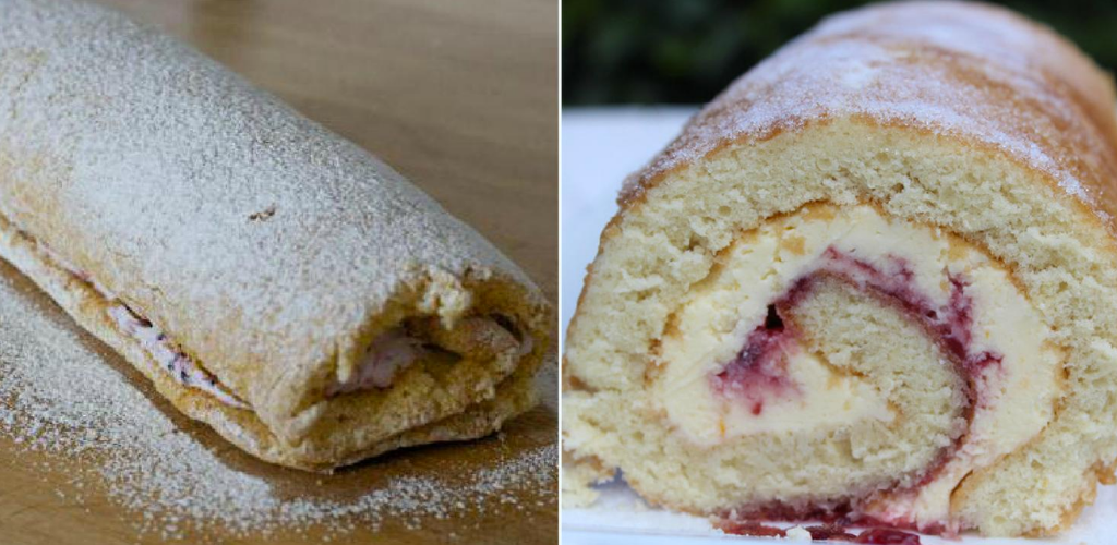 - На серветку посипану цукровою пудрою покладіть готовий бісквіт та скрутіть рулетом.