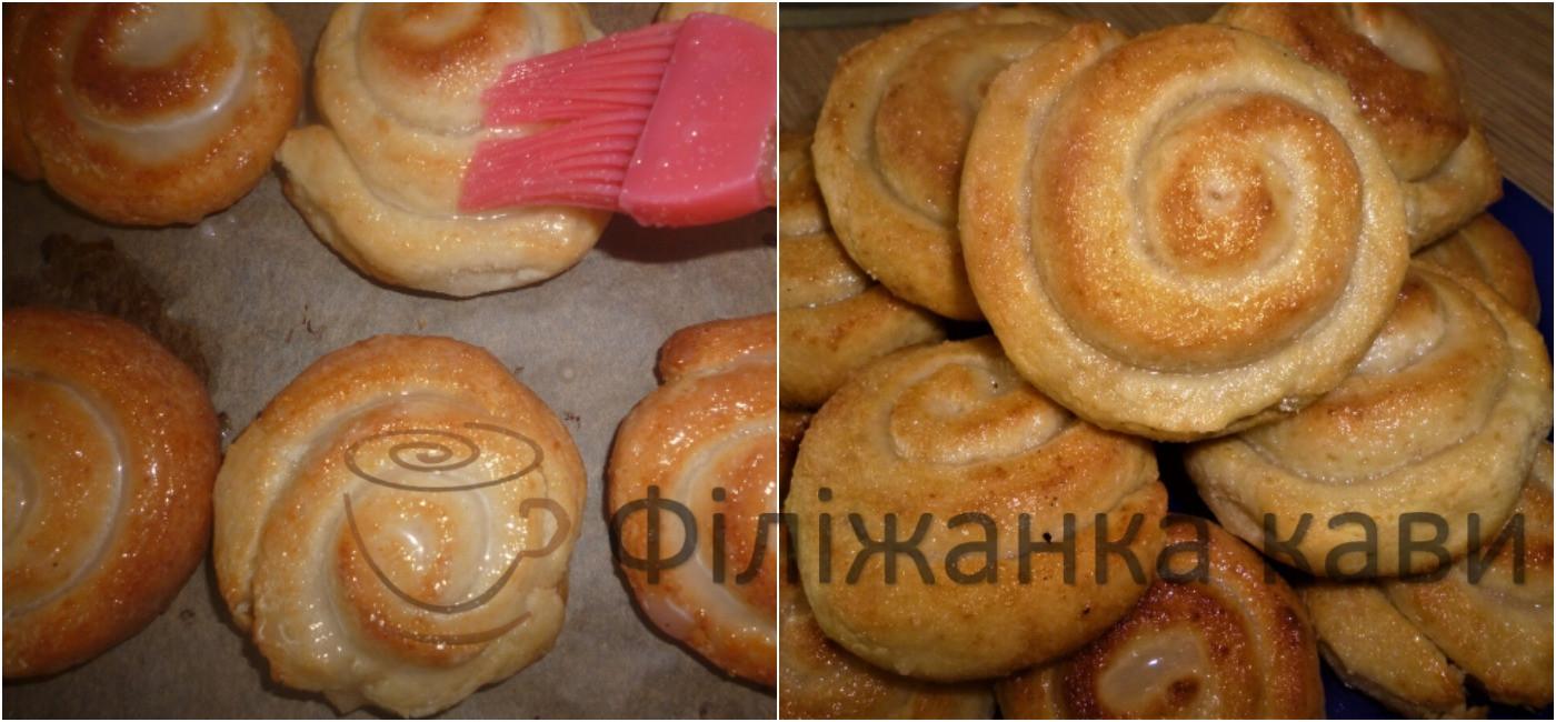 Трохи охололі плюшки змащуємо глазур’ю: зовсім небагато, заливати не потрібно.