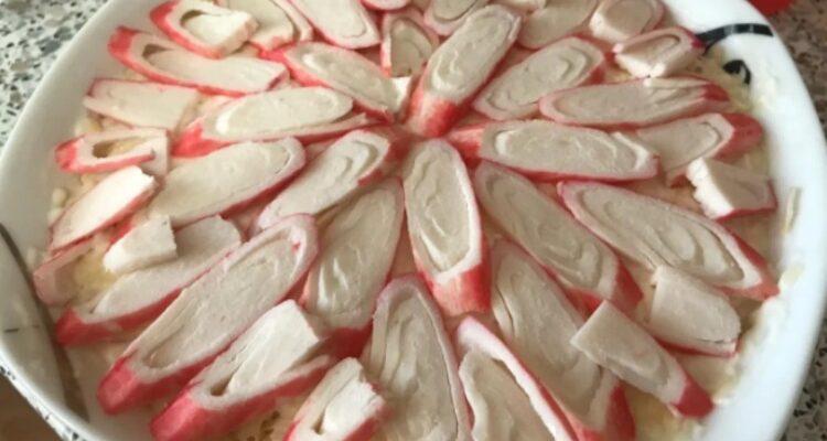 Беру 220 грамів крабових паличок і грубо нарізаю. Половину залишаю для прикраси.