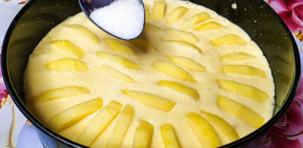 Змішуємо тісто з збитими білками. Приготуйте форму 22 сантиметри в діаметрі, застеліть дно пекарним папером, а зверху змастіть соняшниковою олією. Тепер рівномірно по формі розподіліть тісто. Очищені яблука розрізаємо на дольки і красиво викладаємо поверх тіста. Зверху майбутній пиріг присипаємо цукром.