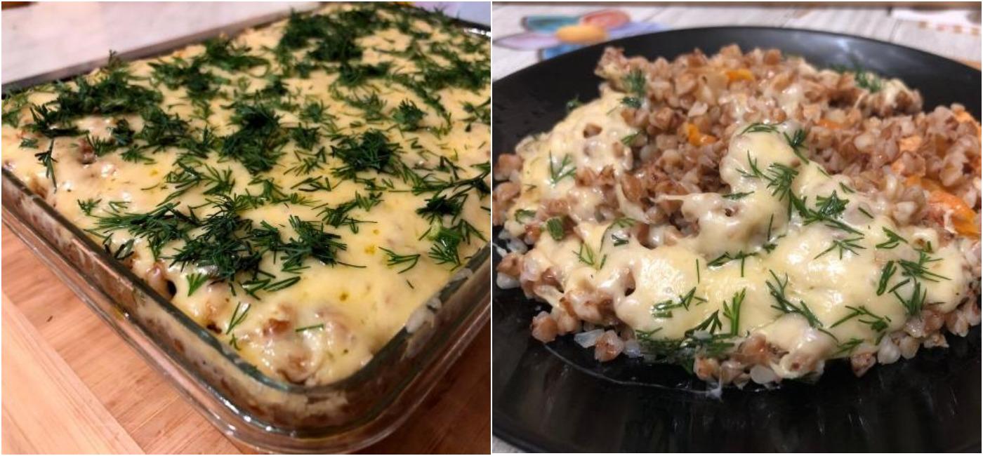 Сир натираємо на дрібній терці і присипаємо гречку сиром. Знову накриваємо фольгою, знижуємо температуру до 160 градусів і випікаємо ще 10 хвилин.
