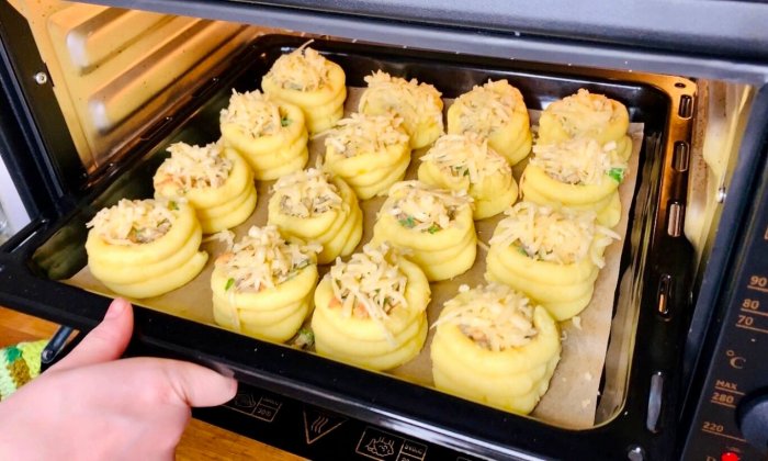 6. Деко вистилаємо пергаментом, злегка змащуємо олією і формуємо картопляні гнізда.
