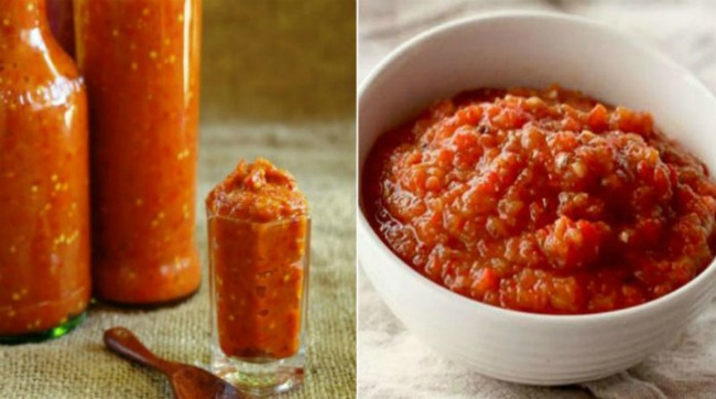 - Пропустіть через м’ясорубку запечений перець, часник, перець чилі і підсмажену цибулю.