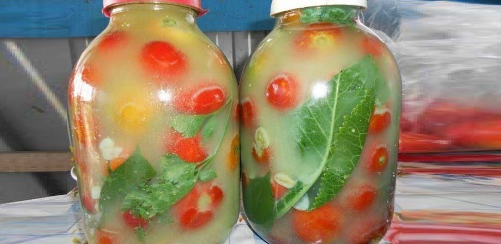 На дно банки скласти листя і спеції, на них помідори, зверху насипати сіль, цукор і гірчицю, акуратно залити холодною водою. Закрити кришкою і потрусити банку, щоб сіль і цукор розчинився. Якщо хочете, щоб заквасилися швидше – на день залишіть у кімнаті. Далі у підвал.