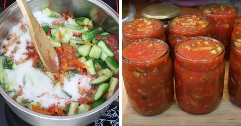 У салат йдуть всі огірки – переростки і овочі неправильної форми. Закуска виходить в міру гострою, з приємною кислинкою. Дуже добре підходить до різних гарнірів (особливо смачно зі смаженою картоплею). Ми томатну заливку використовуємо замість соусу. Спробуйте, це дуже смачно!