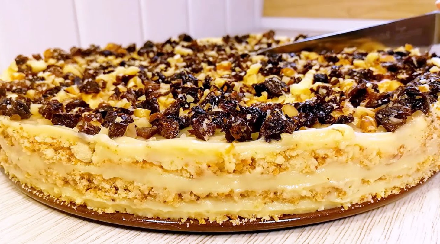 Тортик виходить дуже ніжним і м’яким, особливий смак йому надають чорнослив і горіхи. Сухофрукти і горіхи можна брати будь-які на свій смак.