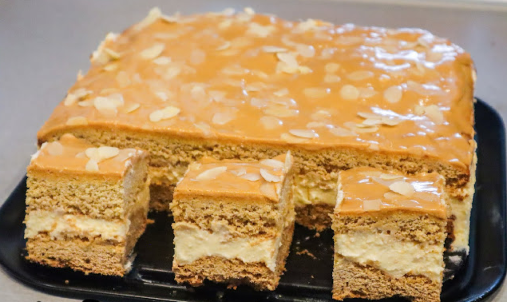 - Верх торта змастити ірисками і посипати мигдальними пластівцями. Поставити торт в холодильник – бажано на ніч.