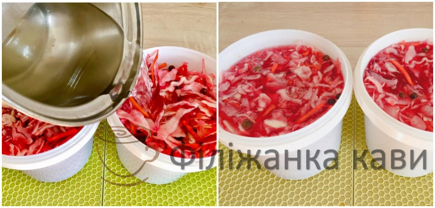 Заливаємо маринадом капусту доверху. Закриваємо кришкою.