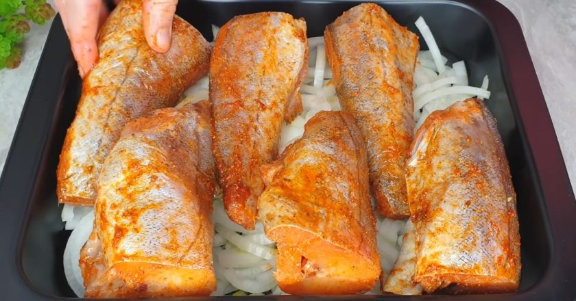 Зверху викладіть рибу, накрийте пергаментом форму. Випікайте блюдо 30 хвилин при температурі 180 °С.
