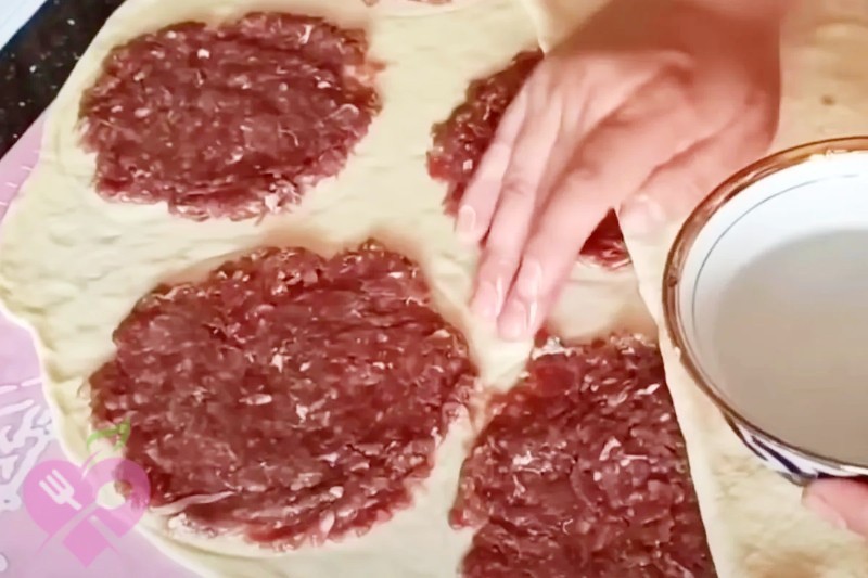 На одному пласті за допомогою піали розмітьте 9 кіл. На кожне коло викладіть кульку фаршу і рівномірно розподіліть начинку по тісту.