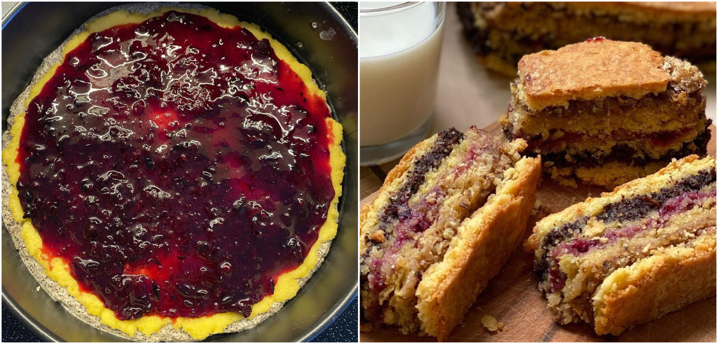 2. Накрити другою частиною, яку змастити повидлом чи викласти вишні, накрити третьою частиною, на яку викласти горіхову масу.