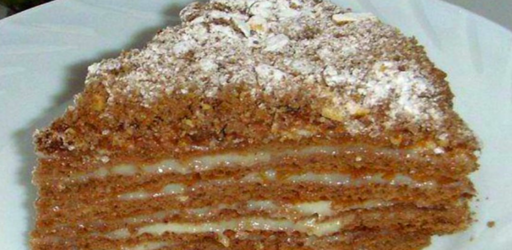 - Замісіть тісто, скачати в ковбаску, розрізати на 8 частин. Спекти 8 тоненьких коржів. Один корж подрібнити для посипання торта.