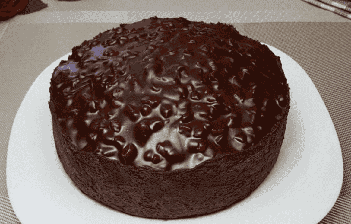 Готовий торт звільняємо від форми і плівки. Бік форми обмащуємо раніше відкладеною шоколадною масою.