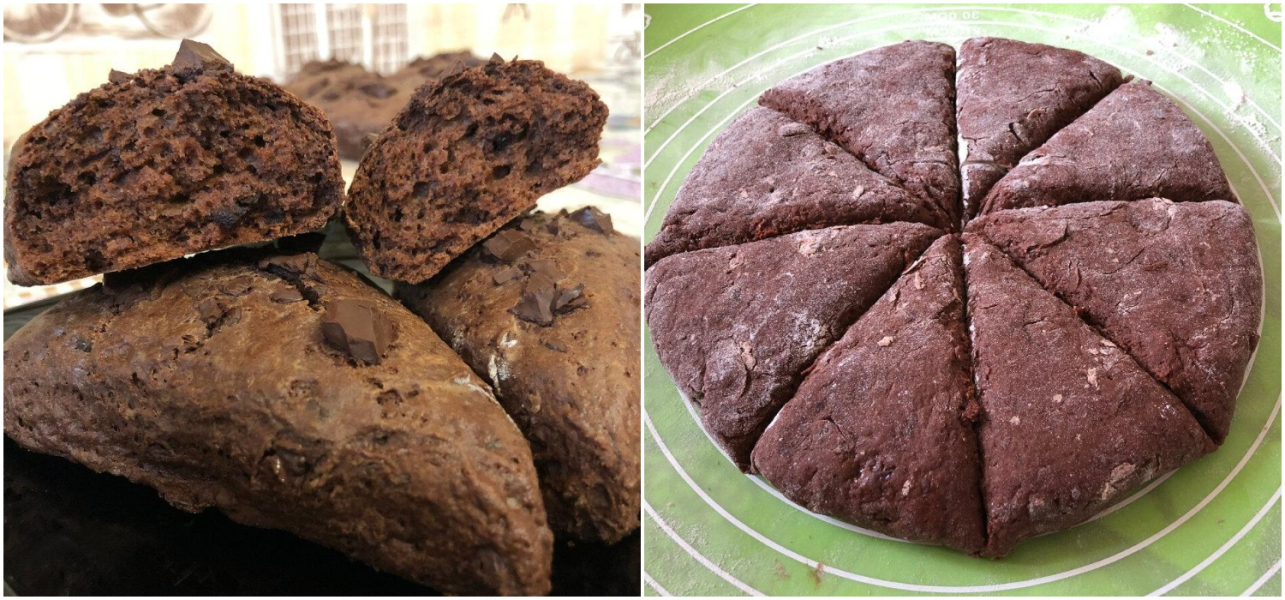 Наші шоколадні сконі готові! Це щось середнє між булочками і печивом) Хрусткі зовні, м’які і пористі всередині з шматочками шоколаду. Дуже смачно!)