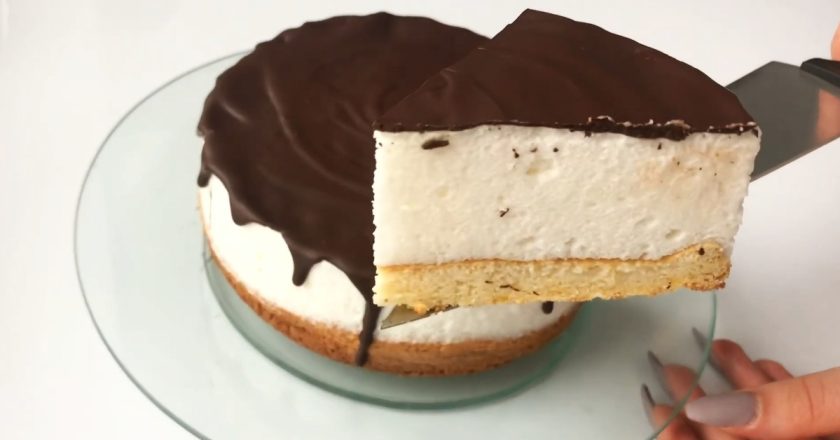 Для приготування десерту потрібна форма діаметром 16 сантиметрів. Так, тортик вийде досить високим та красивим. Пишний бісквіт і високий шар ніжного суфле виглядатимуть як з кондитерської!