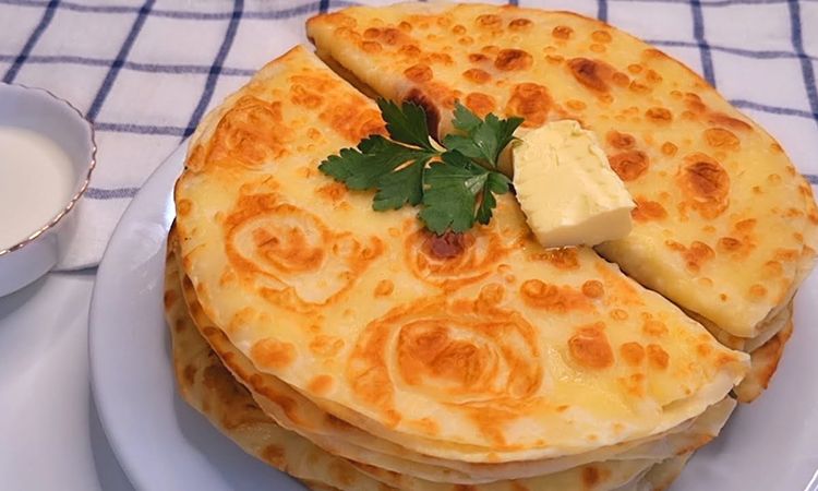 Тепер повертаємо тісто на робочу поверхню. Ділимо на рівні частини (штук 10-15, залеть від розміру вашої сковороди), кожну розкачуємо в тонкий пласт і обсмажуємо на сухій сковороді з обох боків. Кожен корж обов’язково змащуємо вершковим маслом і кладемо тепле картопляну начинку.