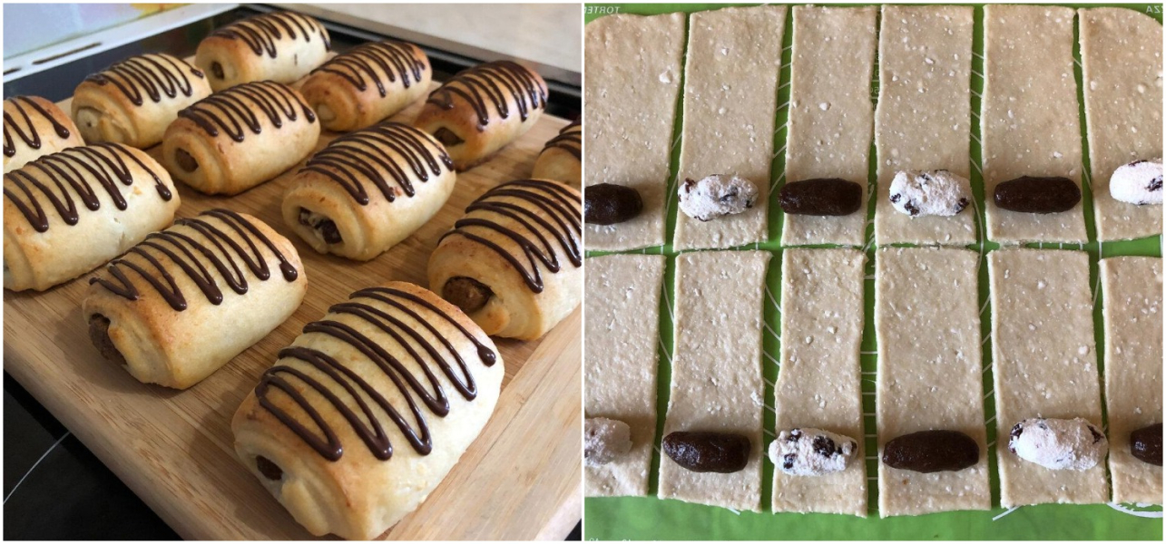 На кожну смужку тіста викладаємо 1 ч. л. начинки і звертаємо в рулетики, защипуючи край.