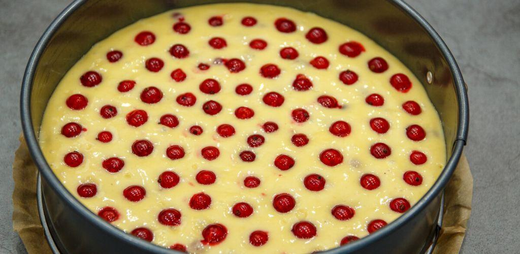 - На даному етапі в тісто додаємо будь-які свіжі або заморожені ягоди, сьогодні пиріг я готую з червоною смородиною. Поєднання солодкого бісквіта і легкої кислинки ідеально для літнього часу. Акуратно вмішуємо ягоди в тісто.
