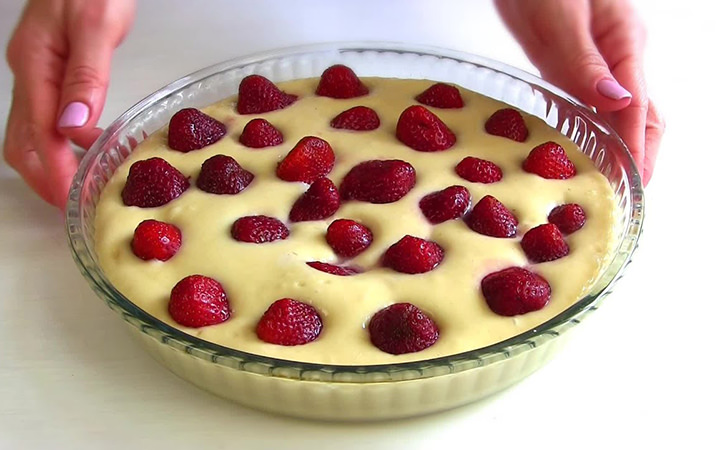 Можна додавати її цілком або розрізати на невеликі частини – головне, щоб ягід було багато. Ставимо полуничний пиріг в розігріту духовку і випікати при 180 градусах 30 хвилин.