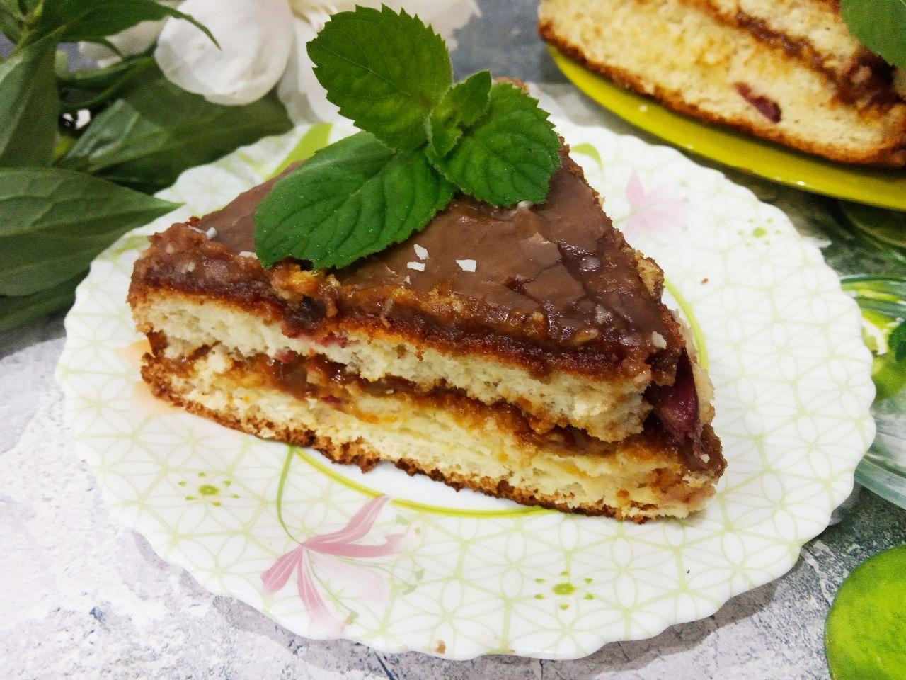 Пиріг в шоколадній глазурі бісквітний повітряний, з прошарком з вареного згущеного молока і з апетитною ягідною кислинкою. Приготувати нескладно, вчора до чаю приготувала, пиріг сподобався.