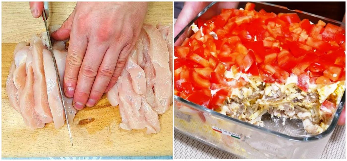 Дуже смачний та простий салат, який ви можете зробити на кожен день. Свіжий салат з курячого м’яса та маринованої цибулі з помідорами.