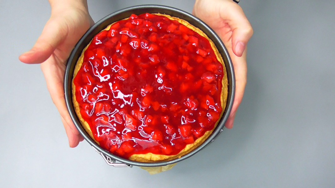 ✅Коли і пиріг, і полунична маса охолонуть до теплого стану, заливаємо ягоди зверху. Забираємо пиріг у холодильник на кілька годин, не виймаючи його з форми.