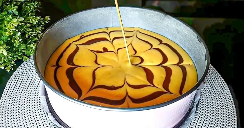 По черзі виливайте шоколадне та біле тісто. Коли вони закінчаться, за допомогою шпажки зробіть візерунок. Випікайте пиріг у розігрітій до 180 градусів духовці 35-40 хвилин.