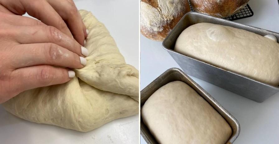 Форми для випікання змастіть вершковим маслом. Сформуйте хліб у вигляді двох батонів та перекладіть їх туди. Накрийте рушником і залиште відпочивати при кімнатній температурі на півтори години. Тісто має піднятися практично до країв форми.