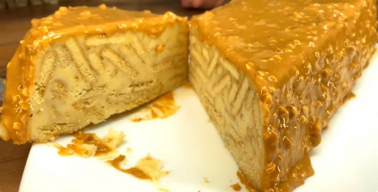 5. Далі зверху на десерт поливаємо арахісовою пастою. Нарізаємо на порційні шматочки та подаємо на стіл.
