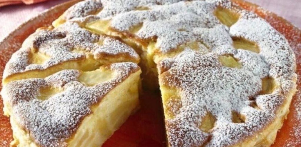 Викладаємо ½ всього тіста в форму, яку потрібно перед цим змастити маслом і посипати борошном. На тісто кладемо яблука і виливаємо другу частину тіста.
