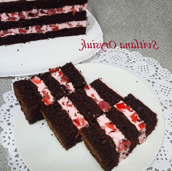 Крем: 600 мл сметани збити з 5 ст.л цукру, додати розварене вишневе желе (1 п желе+150 мл води, розварити і остудити)