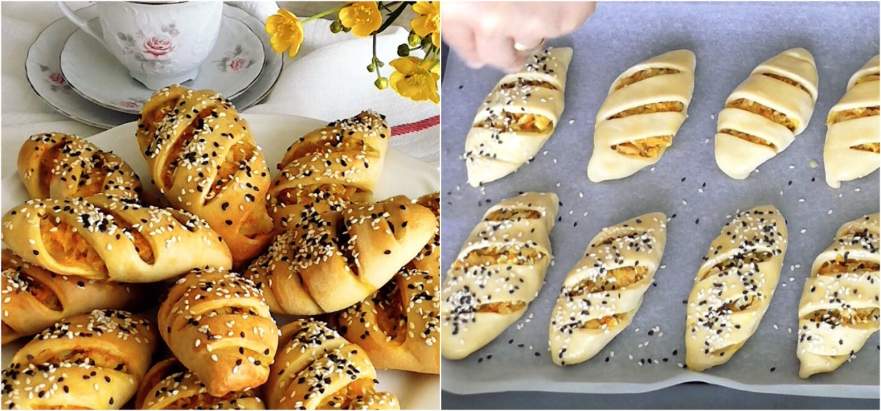 12. Перед випічкою пиріжки змастити яйцем або молоком, присипати кунжутом за бажанням. Випікати пиріжки з капустою в добре розігрітій духовці при 200 гр. С близько 30 хв. Дивіться на особливості своєї духовки!