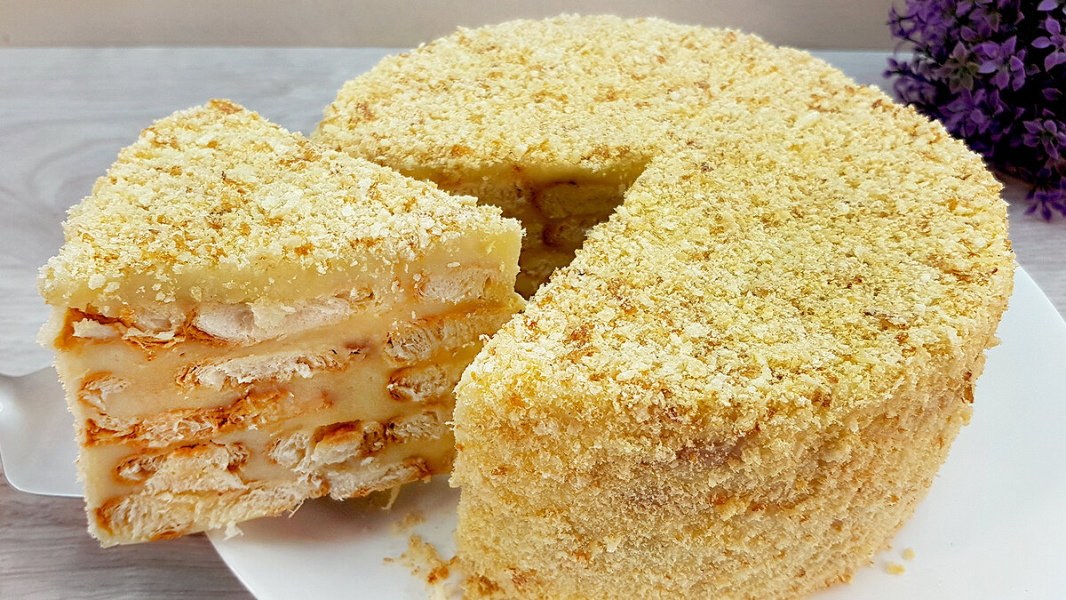 Торт “Наполеон” улюбленець багатьох ласунів. Є багато рецептів “лінивого” торта “Наполеон”. Один із таких тортів у цьому рецепті. Продукти звичайнісінькі, а смак як у справжнього торта “Наполеон”. Крем може бути будь-яким. Мені подобається більше заварний у таких тортах. Між шарами можна додавати ягоди, горіхи, сухофрукти – вибір великий. Щоразу у торта смак буде інший.