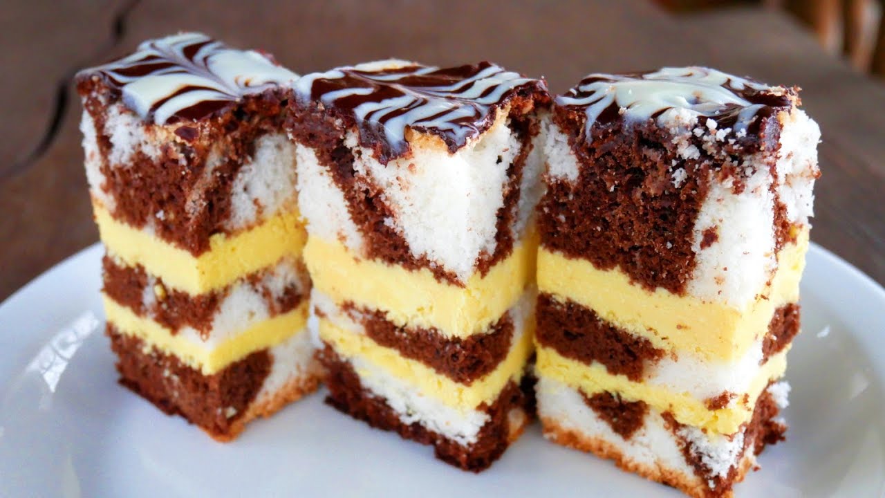 Торт складається з темних і білих коржів, просочених ніжним кремом.
