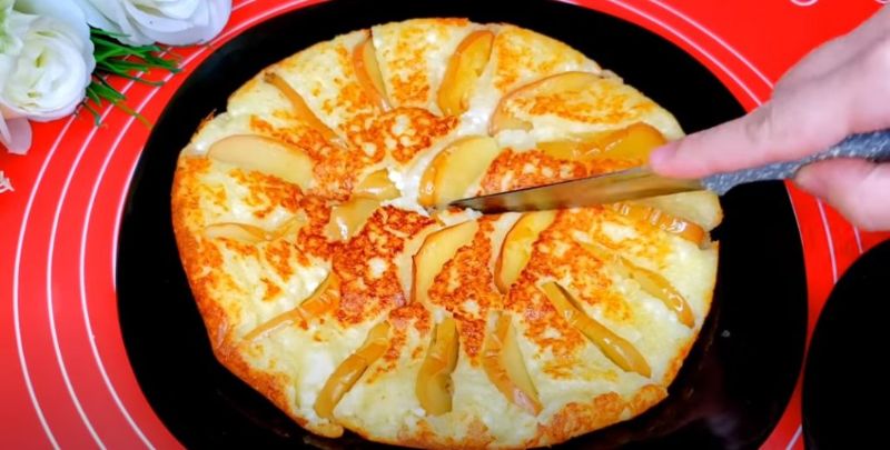 Тепер розігріваємо сковороду, отриману суміш обсмажуємо на ній. У вас має вийти один великий пиріг. Його можна прикрасити часточками яблука, нарізаного на шматочки.