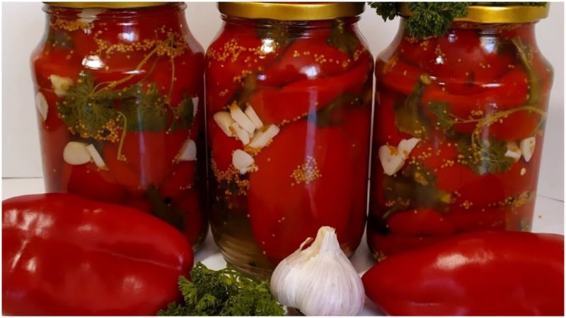 Для цієї кількості перцю знадобиться 3 банки об’ємом 1 літр. У кожну банку помістіть по 5-6 горошин перцю, по одній чайній ложці насіння гірчиці, по кілька гілочок петрушки і по зубчику нарізаного часнику.