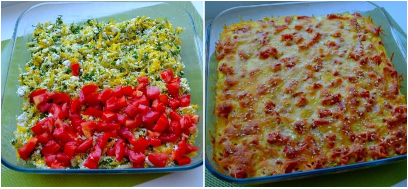 Тепер підготовлену суміш потрібно викласти на деко, зверху посипати нарізаними на дрібні кубики помідорами.