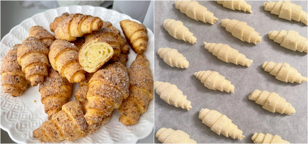 Обмакнути верх рогалика в цукор ( можна цукор+ кориця)