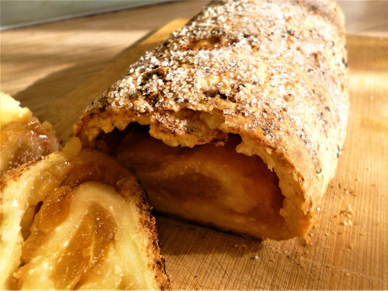 Кладемо рулет на деко. При бажанні можна посипати його корицею або маком. Проколюємо рулет в декількох місцях виделкою.
