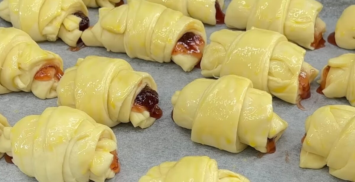Закручуємо в рогалики і викладаємо на деко з пергаментом. Змащуємо збитим яйцем і запікаємо 10 хвилин при 200 градусах.