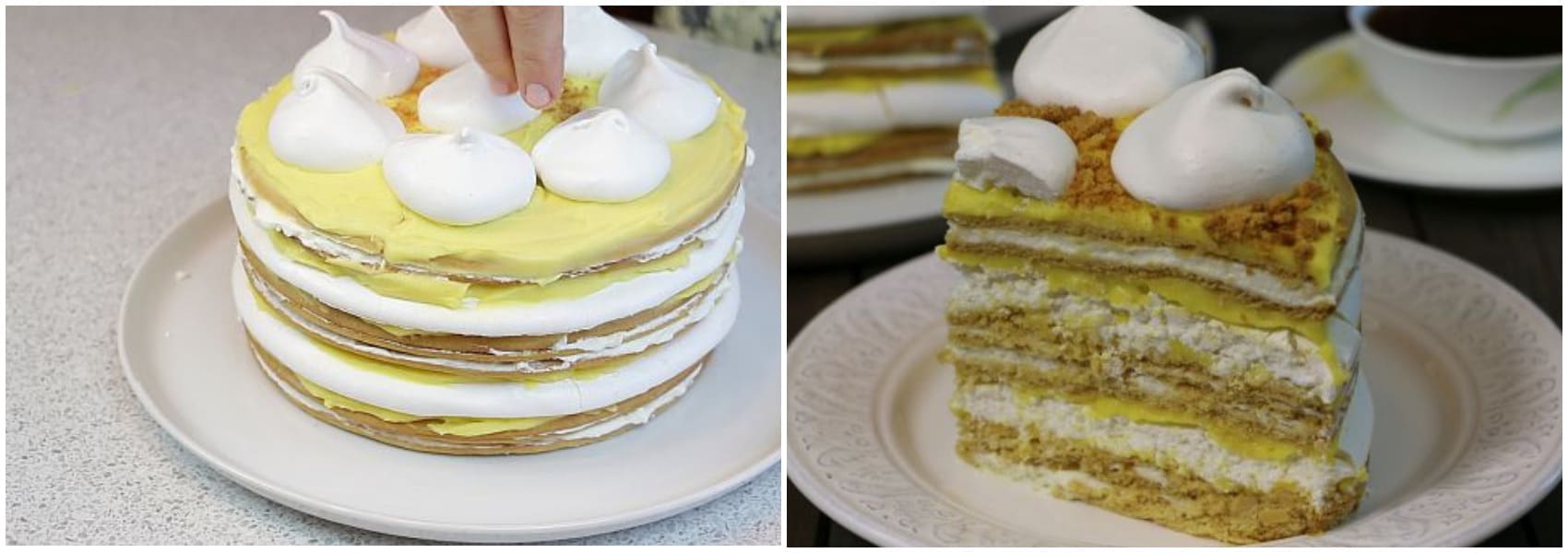 Зверху знову 3 медових коржа зі збитими вершками, знову заварний крем, корж-безе, заварний крем і викладаємо 2 залишилися медових коржа з вершками. На останній медовий корж наносимо 1/5 частина заварного крему. Прикрашаємо безе і крихтою з обрізків медових коржів.