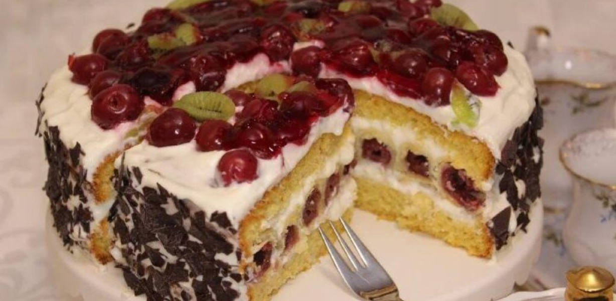 12. Приготувати заливку: 1 стакан вишневого соку змішати з порошком-заливкою для торта, поставити на вогонь і довести до загустіння. Злегка остудити суміш і залити нею вишні і ківі на верхівці.