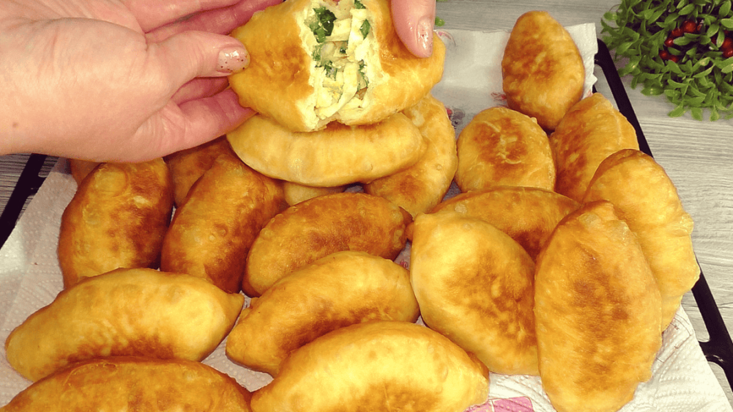 Пиріжки з такого тіста можна смажити на сковороді і пекти в духовці. Завжди смачний результат. Пишні, ніжні, начинка для пиріжків сьогодні літня – з яєць із зеленою цибулею. Начинку Ви можете використовувати будь-яку, на ваш смак. Можна готувати з солодкою начинкою.