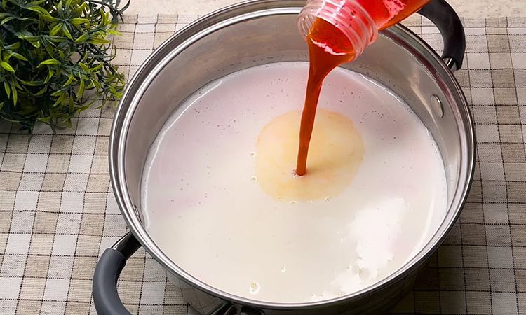 Рецепт простий. Переливаємо молоко у зручний сотейник і ставимо на плиту. Доводимо до кипіння, додаємо сіль. Через півхвилини молоко знову закипить, відразу вливаємо томатний сік, а потім сметану.