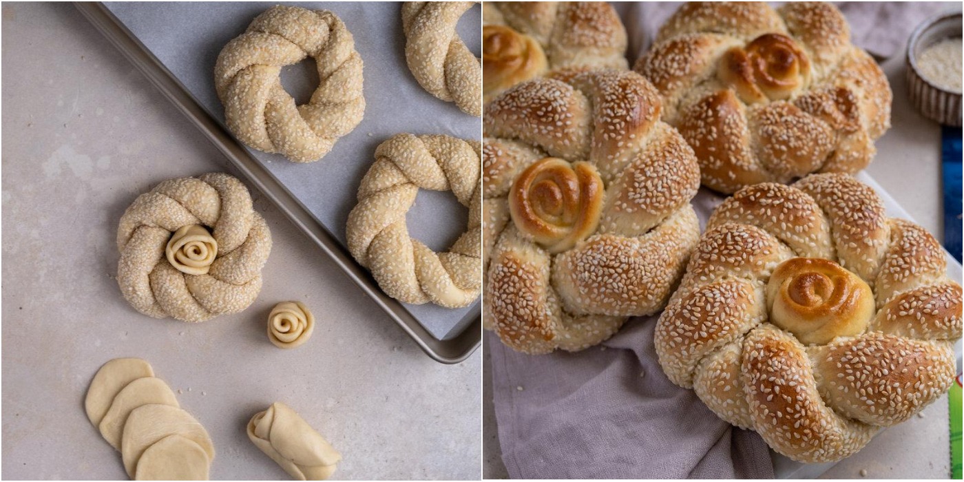 ⑭ Переносимо булочки на деко, застелене пергаментом. Змащуємо квіточки жовтком.