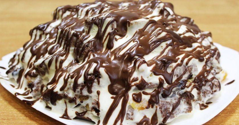 Для того, щоб приготувати таку шикарну солодкість вам не знадобиться багато часу і особливих навичок. Її зможе зробити навіть починаюча господиня. Цей десерт багатьом знайомий з дитинства і став улюбленцем ласунів. Замість чорносливу і родзинок можна використовувати вишню або інші ягоди, наприклад. У будь-якому варіанті такий тортик уплітає за обидві щоки. Зберігайте рецепт в свою кулінарну скарбничку.