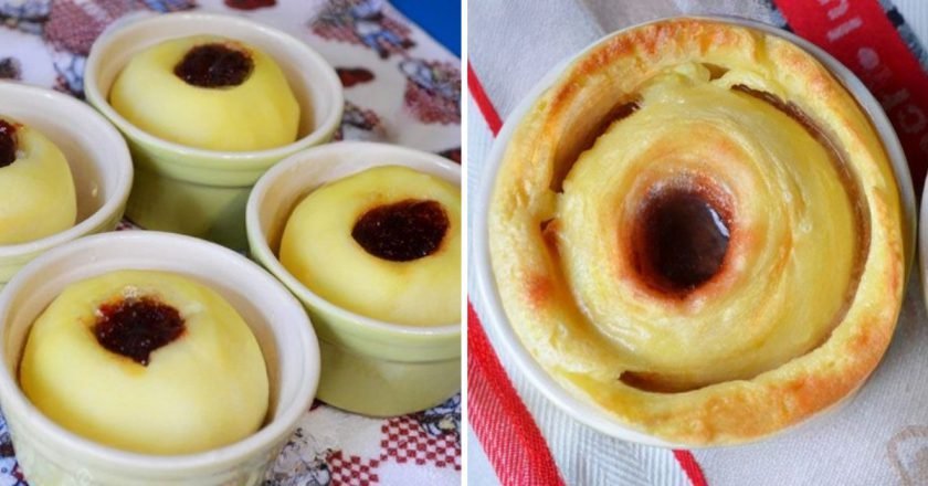 Нафаршуйте яблука варенням або джемом. Підійде продукт із будь-яким смаком. Залийте заготовку сметанним соусом і відправте в духовку на 25-30 хвилин. Готуйте в розігрітій до 180 градусів духовці.